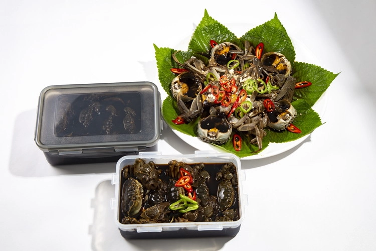 손질한 참게에 국간장과 간장을 섞어 붓고 일주일 후 간장을 따라내어 끓여서 식혀 붓기를
